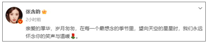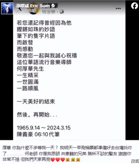 社交平台上,好友替何厚华家属写下讣告,孙耀威、张含韵也在第一时间发文悼念。