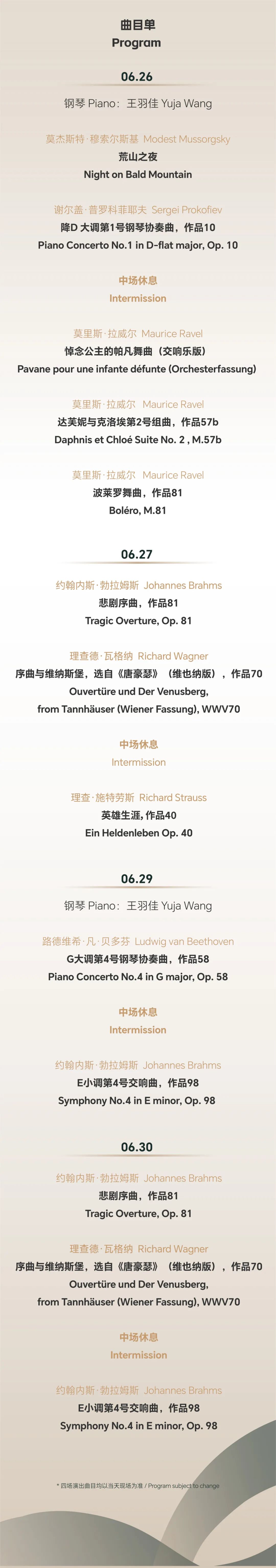 从贝多芬到瓦格纳、勃拉姆斯、施特劳斯、拉威尔,再到穆索尔斯基、普罗科菲耶夫,曲目单中涵盖了古典主义、浪漫主义曲目以及俄罗斯音乐。