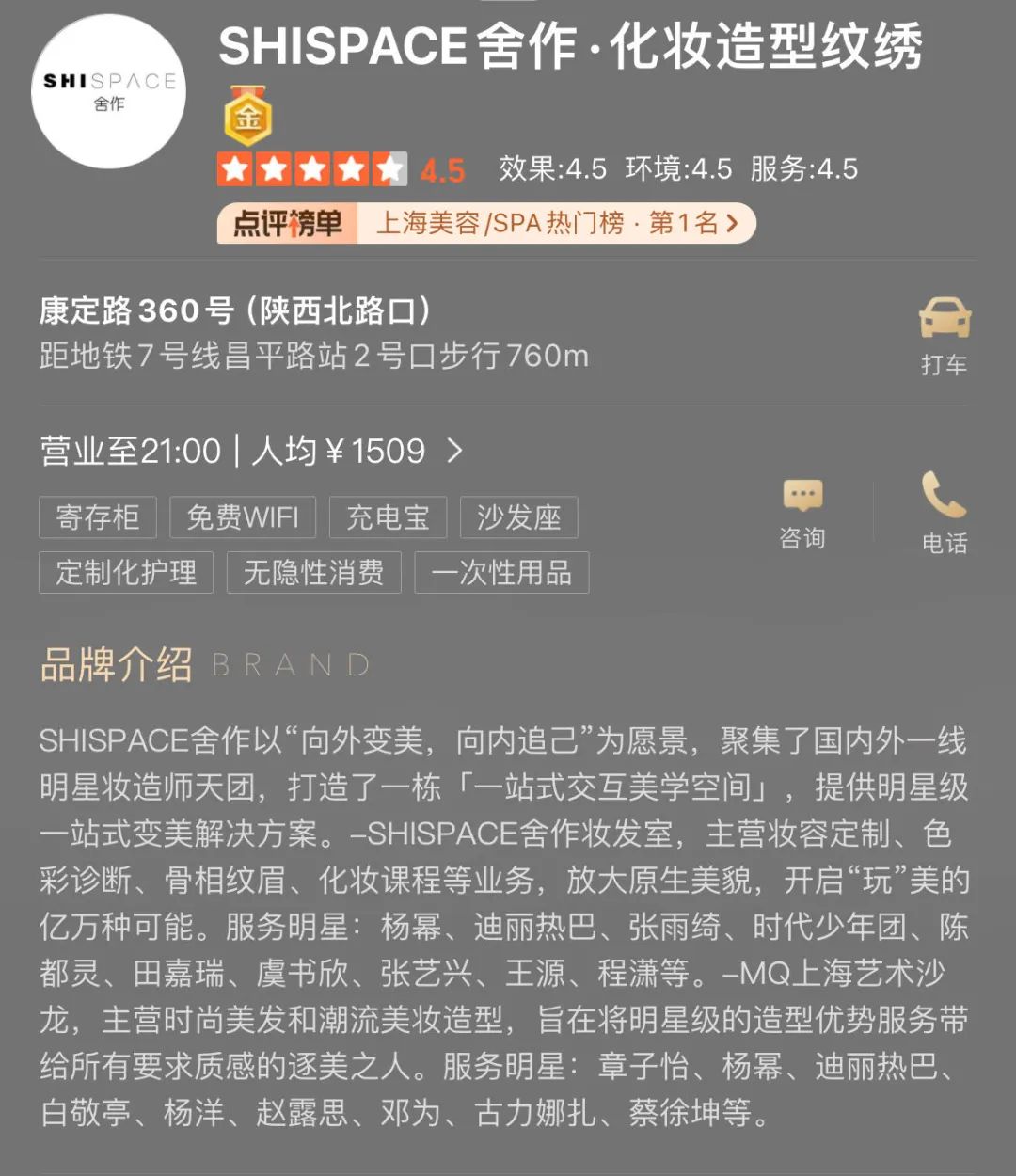 据大众点评商家品牌介绍,SHISPACE舍作主营妆容定制、色彩诊断、骨相文眉、化妆课程等业务。其服务明星有“杨幂、迪丽热巴、张雨绮、时代少年团、陈都灵、田嘉瑞、虞书欣、张艺兴、王源、程潇等”。