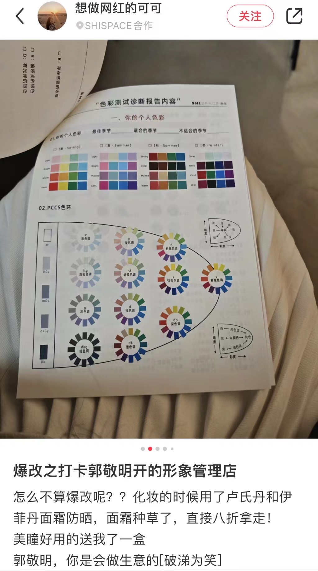 4月13日,#郭敬明新店开业3个月靠色彩测试赚70万#登上热搜,对此,有网友表示“有一说一他审美没问题”“这个价格在上海不算高。”也有一些网友质疑“色彩测试”是“智商税”“虚荣税”,还有人调侃“世界是一个巨大的小时代”。