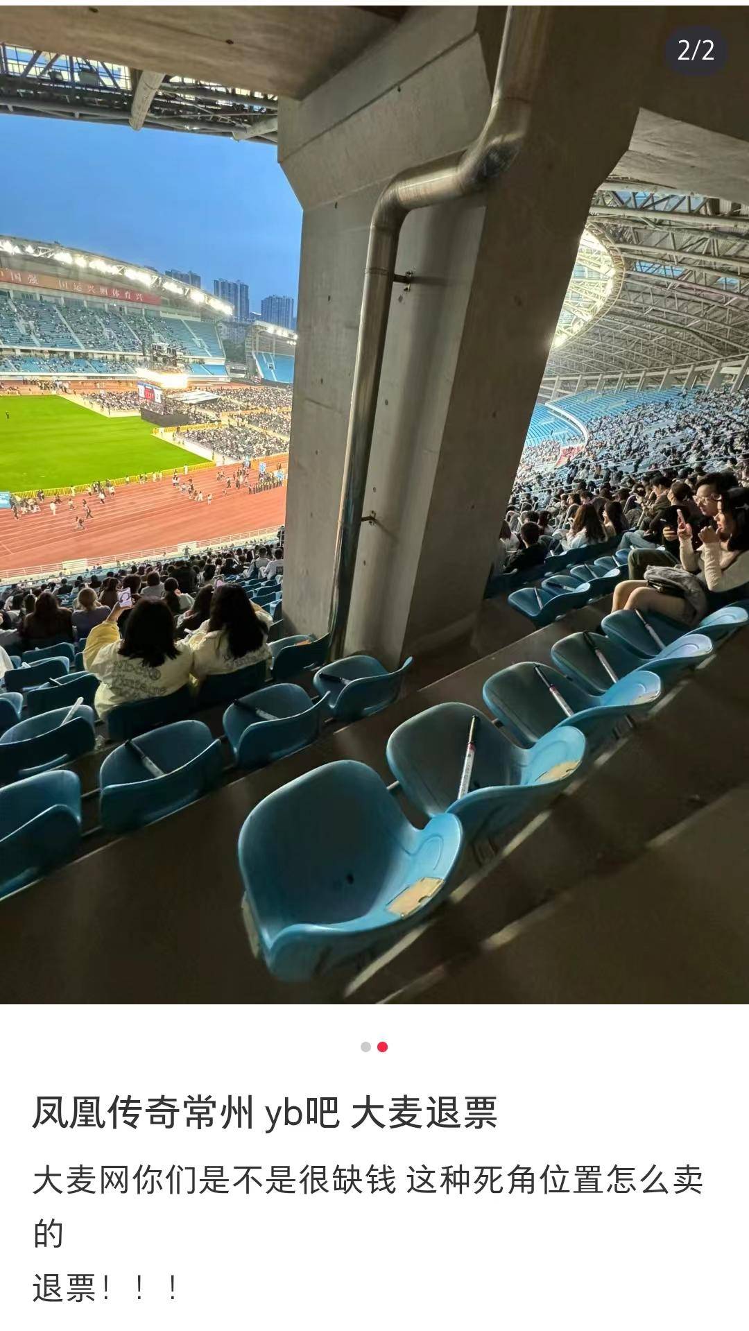 4月20日-21日,凤凰传奇“吉祥如意”2024巡回演唱会首站在常州奥林匹克体育中心体育场举行。但演出结束第二天,就有网友发帖表示自己在大麦上买到了“柱子票”,视野非常差。该网友表示大麦方面给出了退款建议,但被其拒绝,“我希望平台退款加赔偿,并重视屡次出现的‘柱子票’问题。”