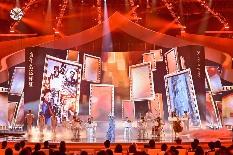 闭幕式现场,由张靓颖献唱的《时光的歌》回顾电影发展史中的经典作品,将歌手的声音、主视觉的演绎、舞者的表达三种丰富且完整的元素汇聚至舞台之中,形成了一条蜿蜒流淌的电影长河,象征着电影艺术史的流动与延续。周深带来一首娓娓动听的《望》,致敬那些为我们留下过永恒记忆的电影人们。