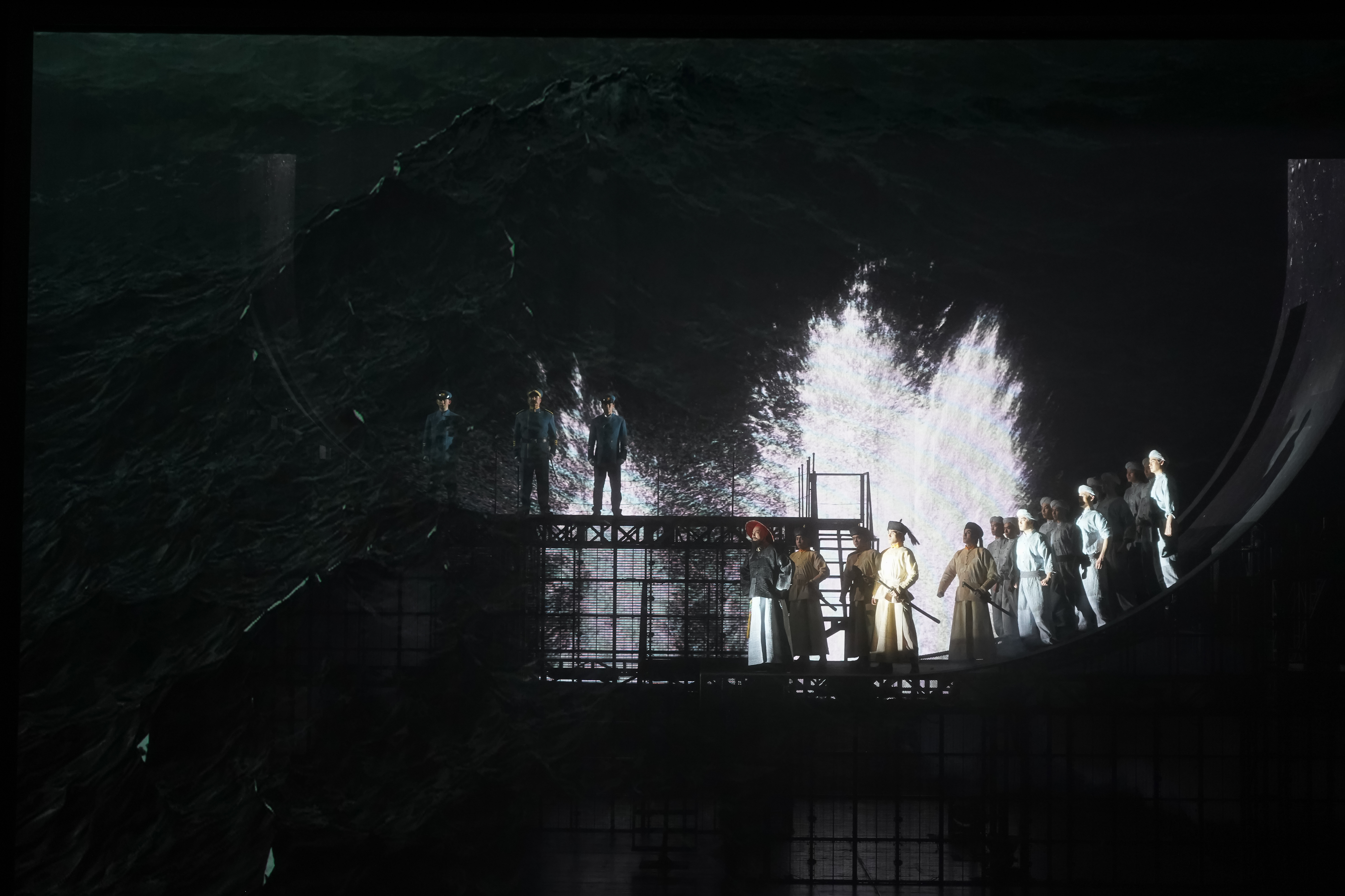 黄海大海战这场戏无疑是全剧的高潮。“致远号”在弹药将尽且遭受重创后,由管带邓世昌下令冲向日本联合舰队旗舰“吉野”,欲与敌同归于尽,不幸被敌击中鱼雷发射管引发管内鱼雷殉爆沉没,全舰官兵246人为国殉难。多媒体设计胡天骥利用近五百平的冰屏,将海战的炮弹出膛、浪花飞溅,以及战舰交叉换位、飞速前进的画面打造出“裸眼3D”的逼真视效。伴着激昂的配乐,邓世昌挺立舰艏,选择“一生赴此一战,成浩然之气,护佑中华!”