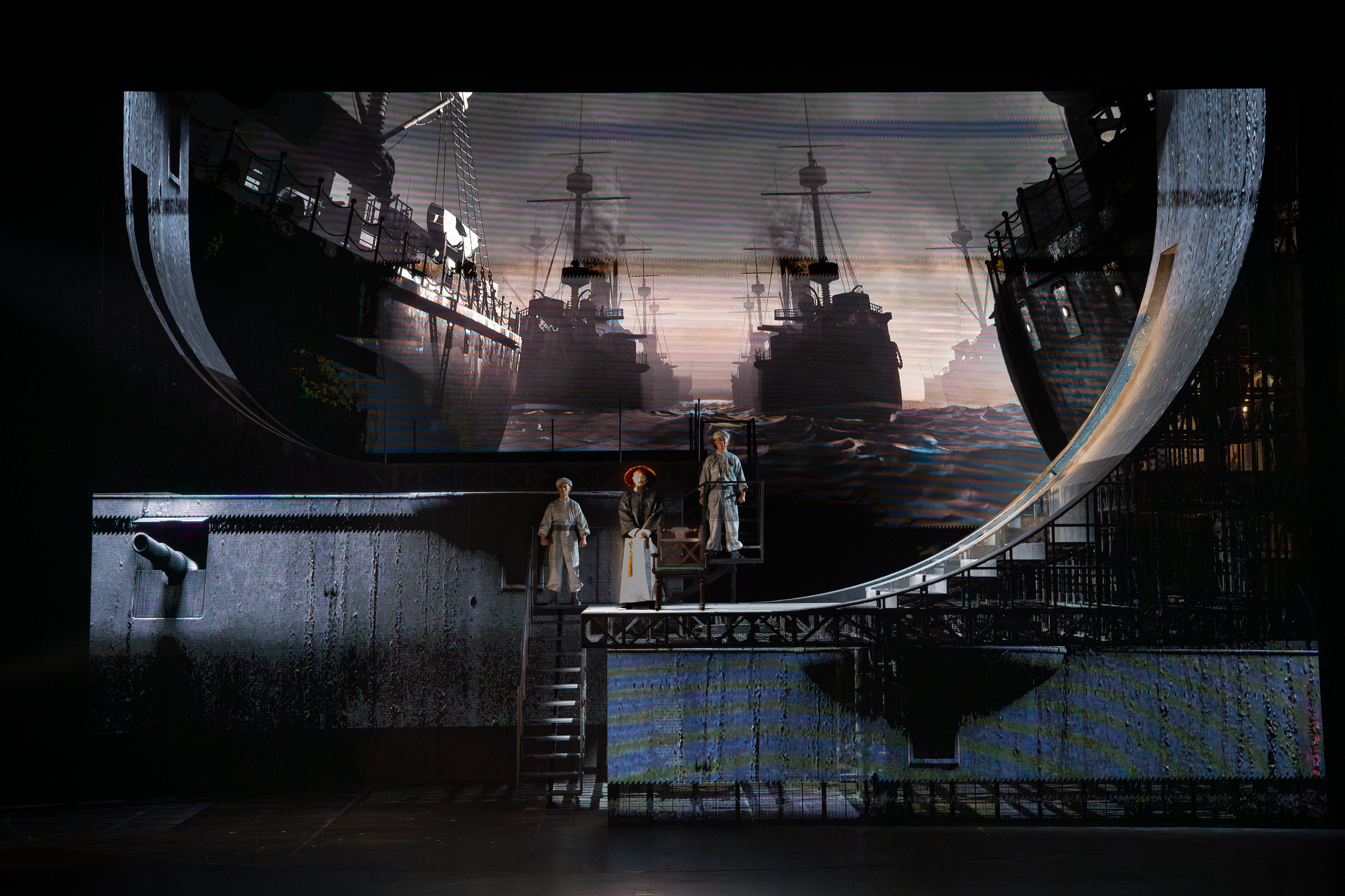 话剧《邓世昌》的舞美设计令人拍案叫绝。舞美设计师季乔介绍说,整个舞台采用矩阵式的战舰“龙骨”与平行的“透屏”交叠构成,既带有洋务运动时期工业风的机械质感,又将国画的水墨气韵融入其间。这样的设计既承载了北洋水师操训备战的场面,又将剧情发展中出现的邮轮、宫