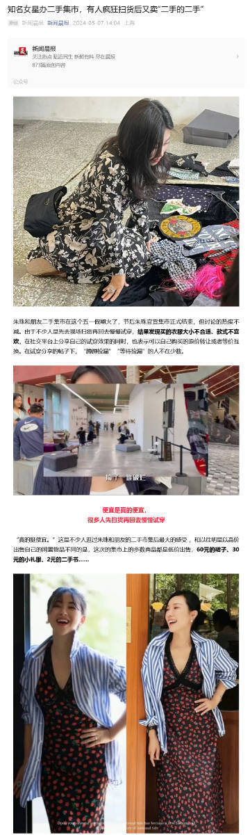 朱珠和朋友二手集市在这个五一假期火了,节后朱珠官宣集市正式结束,但讨论的热度不减。这次的集市上的多数商品都是低价出售,60元的裙子、30元的小礼服、2元的二手书……由于不少人是先去现场扫货再回去慢慢试穿,结果发现买的衣服大小不合适、款式不喜欢,于是表示可以原价转让或者等价互换。有网友分析,这次出圈的朱珠二手衣集市在国内二手衣集市的发展中算是具有里程碑式的意义,“可能是国内第一个真正出圈的二手集市”。(新闻晨报)