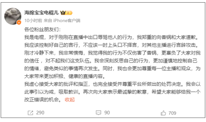 对于刚刚在直播中出口辱骂他人的行为,我郑重的向香锅和大家道歉。我应该控制好自己的言行,不应该一时上头口不择言,对其他主播进行言辞攻击。