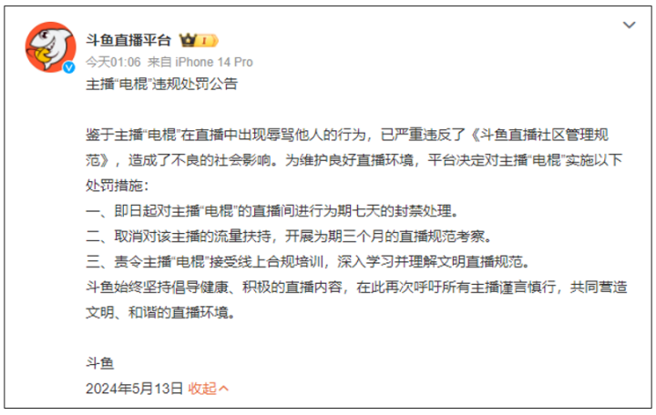 随后,斗鱼官方深夜发布处罚公告:
