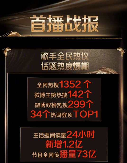 时隔四年,综艺节目《歌手2024》以直播形式重启,首期竞演后,据《歌手》节目组整理,其首播收视便四网断层第一,全网热搜1352个、微博主榜热搜142个、全网传播量73亿。