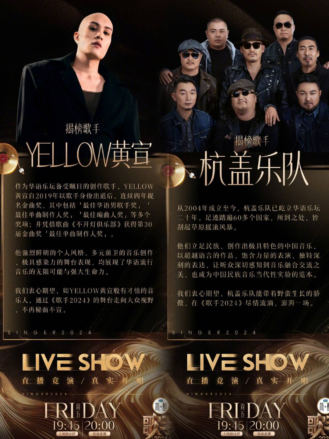 早些时候《歌手》官方微博还公布了首轮双揭榜歌手。综合演唱能力、音乐作品、舞台风格、市场潜力、揭榜报名微博反响等多个维度考量,专家顾问团决定推选歌手杭盖乐队、黄宣为首轮揭榜歌手。