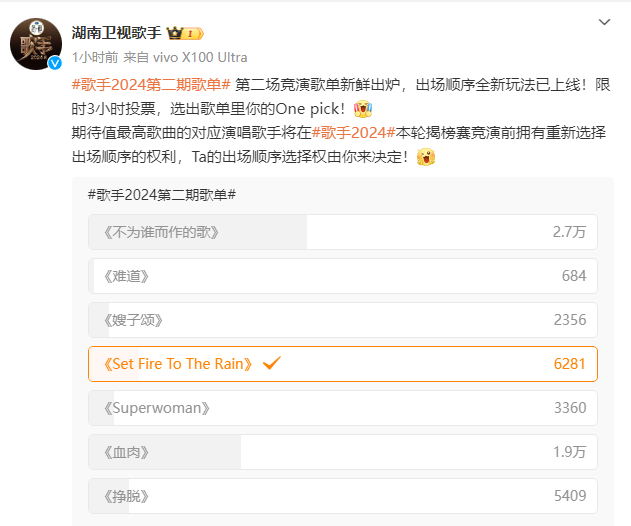 第二场竞演歌单新鲜出炉,出场顺序全新玩法已上线!限时3小时投票,选出歌单里你的Onepick!期待值最高歌曲的对应演唱歌手将在《歌手2024》本轮揭榜赛竞演前拥有重新选择出场顺序的权利,Ta的出场顺序选择权由你来决定!