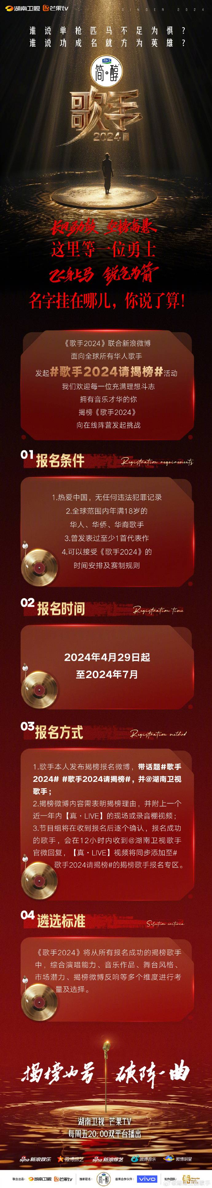 歌手本人发布揭榜报名微博,带话题#歌手2024##歌手2024请揭榜#,并@湖南卫视歌手;揭榜微博内容需表明揭榜理由,并附上一个近一年内【真·LIVE】的现场或录音棚视频;节目组将在收到报名后逐个确认,报名成功的歌手,会在12小时内收到@湖南卫视歌手官微回复。