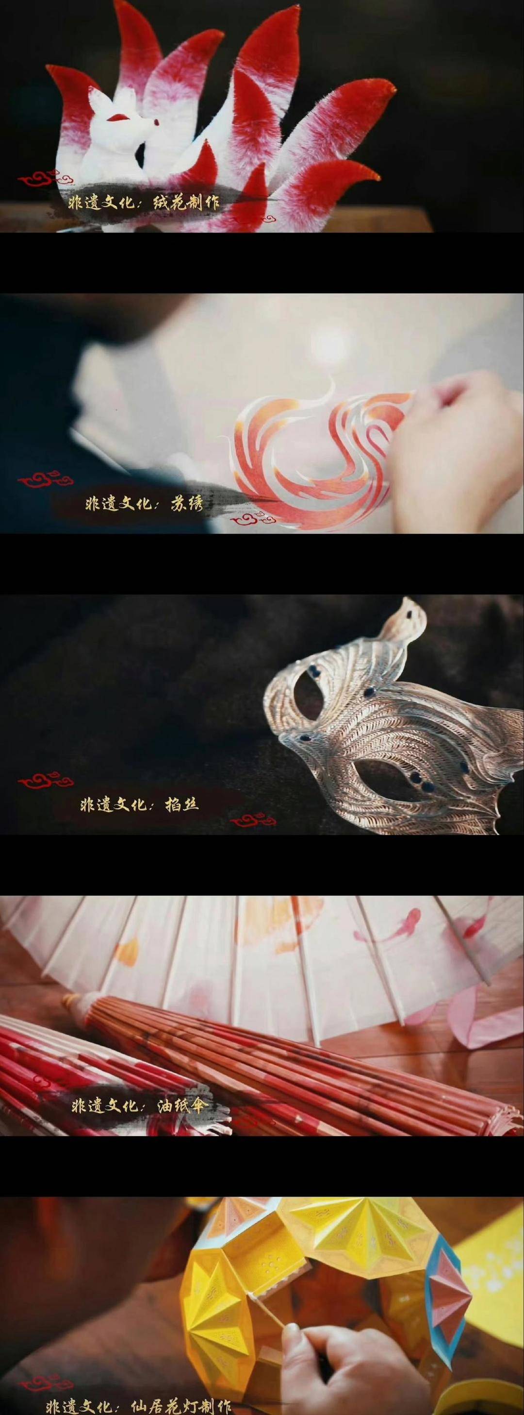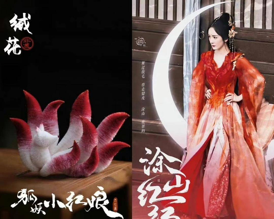 在服化道的制作中融入非遗文化元素,也号称是《狐妖小红娘月红篇》的一大看点。该剧将南京绒花、吴罗织造、花丝镶嵌、仙居花灯、油纸伞、杭扇等非遗制作技艺应用于服装造型和道具制作,让千年华夏文明和工匠精神在荧屏上“活起来”。剧中涂山三姐妹的服装、头饰、红红月初的面具等都融入了非遗文化元素,将传承千年的东方文化与剧中的狐妖绮丽世界形成紧密连接。