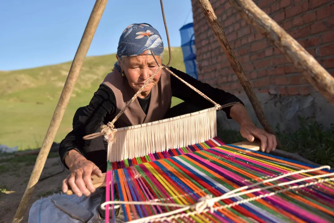 在新疆阿勒泰地区福海县牧区,牧民在制作毡房饰品。(2019年6月5日摄)