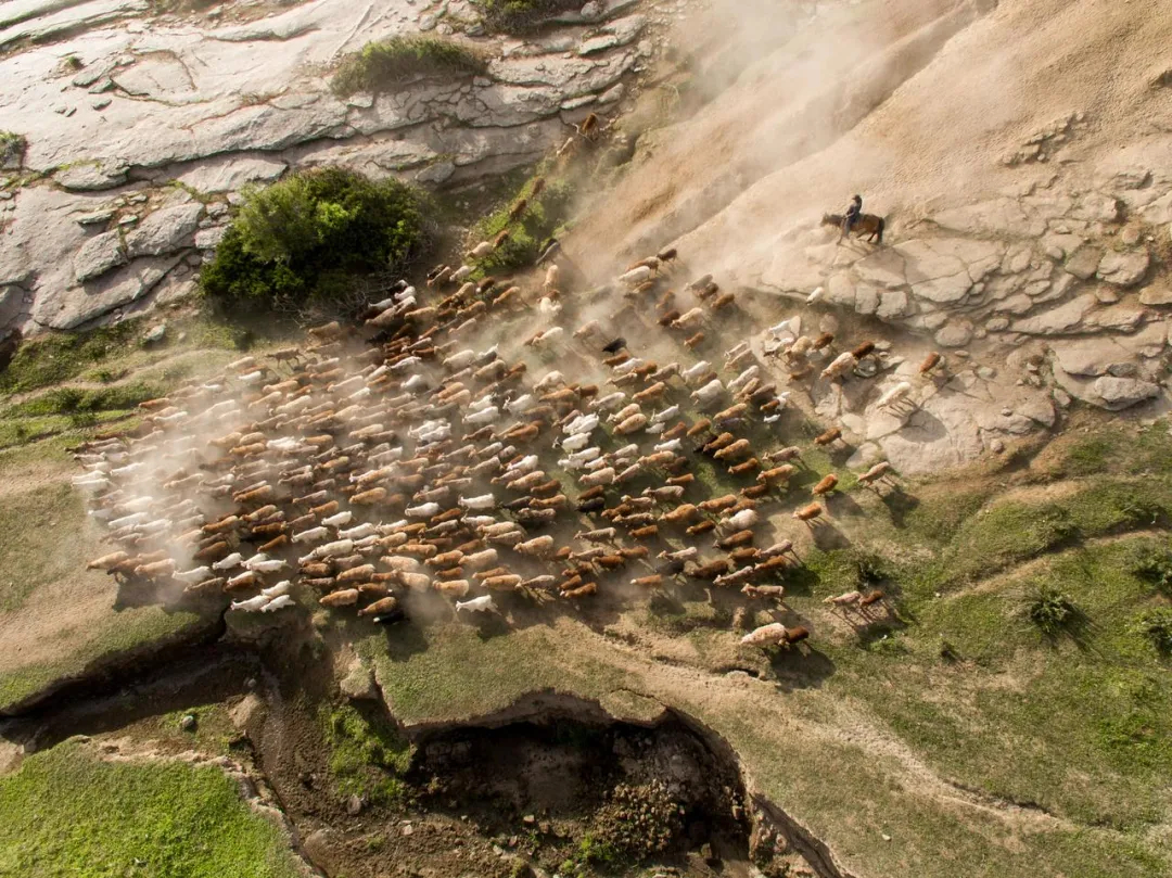 如果从高空俯瞰阿勒泰地区,由北向南,可以从白雪皑皑的山顶到广袤森林,再从苔原转身来到阳光明媚的草甸,最后走向准噶尔盆地中心的荒漠。游牧民族逐水草而居,每年依照牧草生长周期、带领牲畜长距离转移草场。“转场”是游牧生活独特的文化。