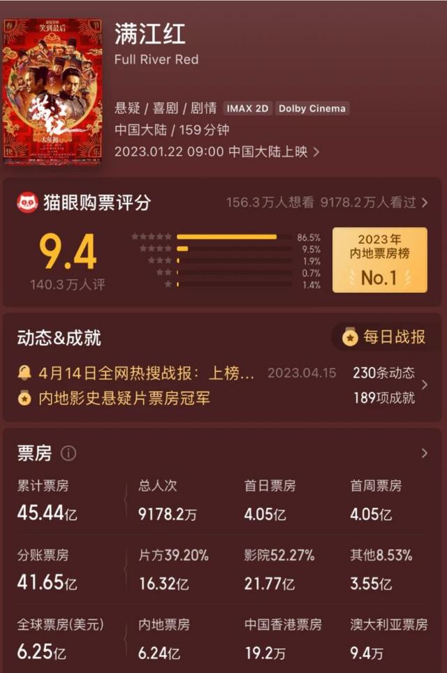 欢喜传媒最近一次“压中宝”,还是2023年春节档的票房冠军《满江红》。该电影由欢喜传媒主投主控、张艺谋执导,不仅成为档期榜首,也成为2023年中国内地票房年度冠军,累计斩获45.44亿元,位列中国电影史票房榜第六。