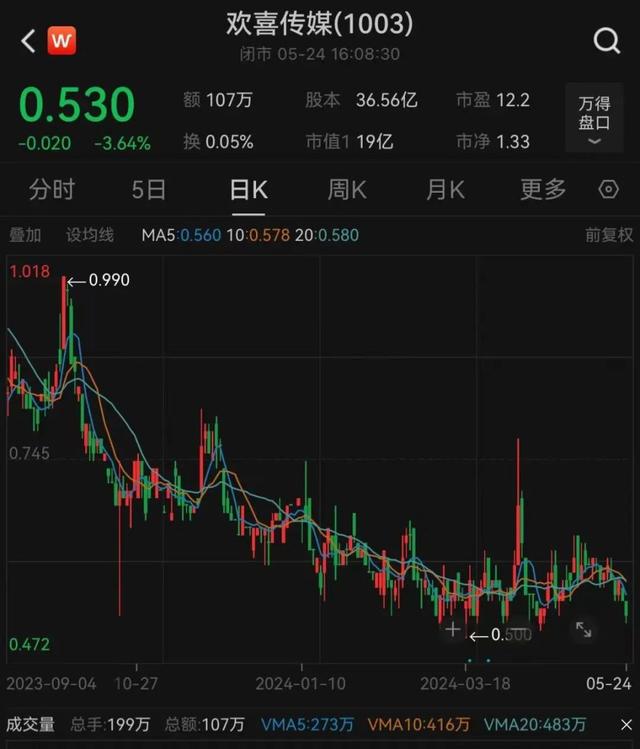 不过,欢喜传媒近期股价却接连走低。截至5月24日收盘,欢喜传媒股价为0.53港元/股,当日跌幅为3.64%,最新总市值为19亿港元。