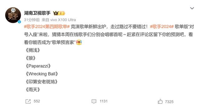 今日,《歌手2024》第四期竞演歌单新鲜出炉,分别为《搁浅》《狼》《Paparazzi》《Wrecking Ball》《印第安老斑鸠》《雨天》。其中《搁浅》《印第安老斑鸠》两首都是周杰伦的歌。