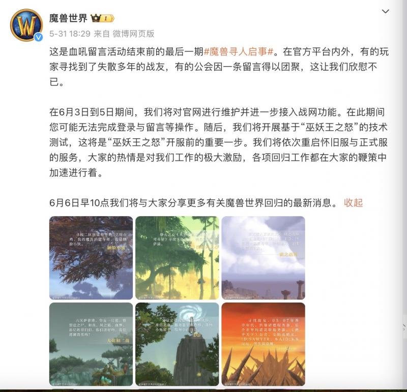 《魔兽世界》官方微博此前表示,“在6月3日到5日期间,我们将对官网进行维护并进一步接入战网功能。在此期间您可能无法完成登录与留言等操作。随后,我们将开展基于“巫妖王之怒”的技术测试,这将是“巫妖王之怒”开服前的重要一步。我们将依次重启怀旧服与正式服的服务,大家的热情是对我们工作的极大激励,各项回归工作都在大家的鞭策中加速进行着。”不过,其中并未透露6月5日就可以登录,因此不少玩家感到惊喜。