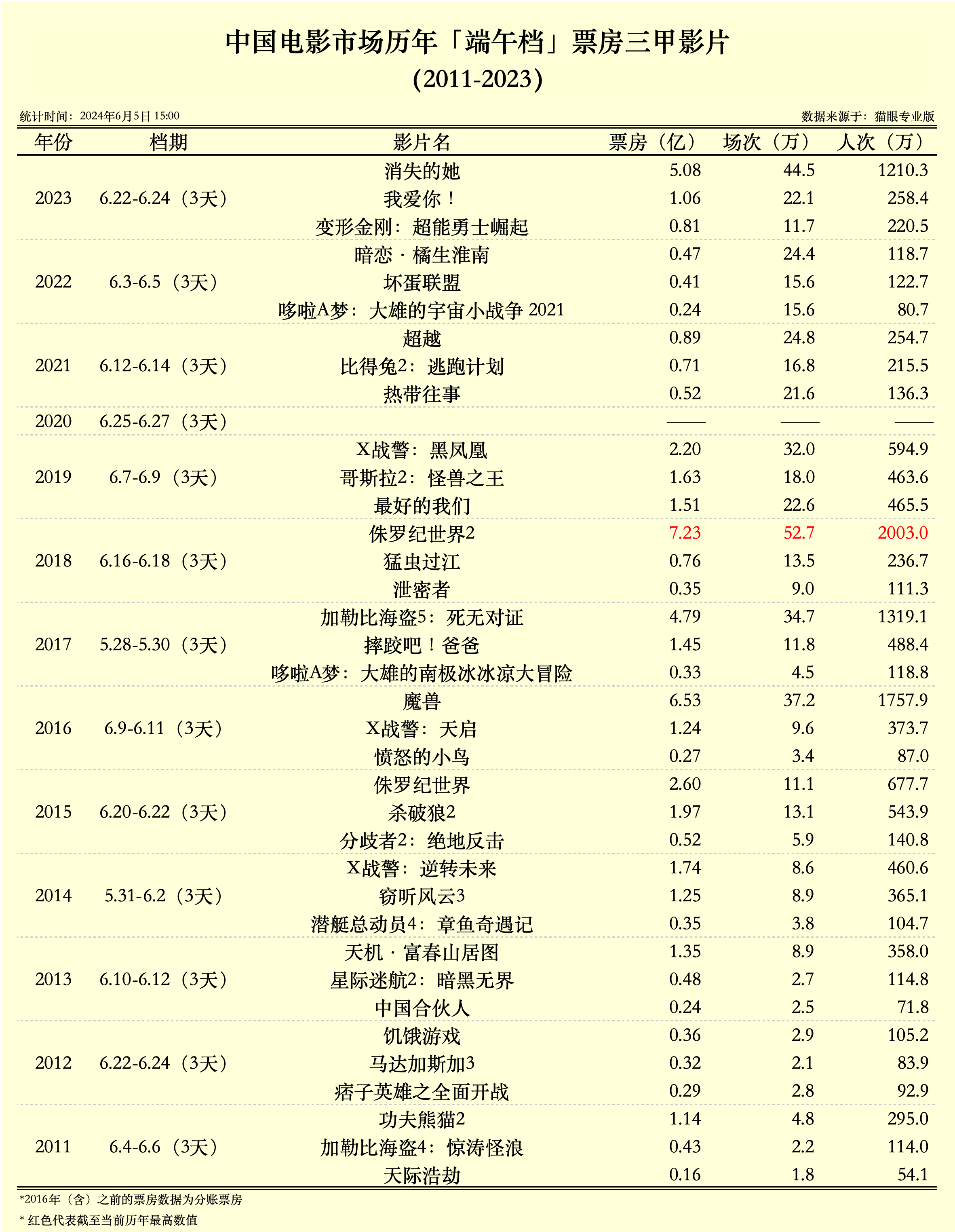 比如2023年的爆款影片《消失的她》就在端午三天假期拿下了5亿票房。2019年的端午档票房第一是《X战警:黑凤凰》,2018年的端午档票房第一是《侏罗纪世界2》,2017年的端午档第一名是《加勒比海盗5:死无对证》。