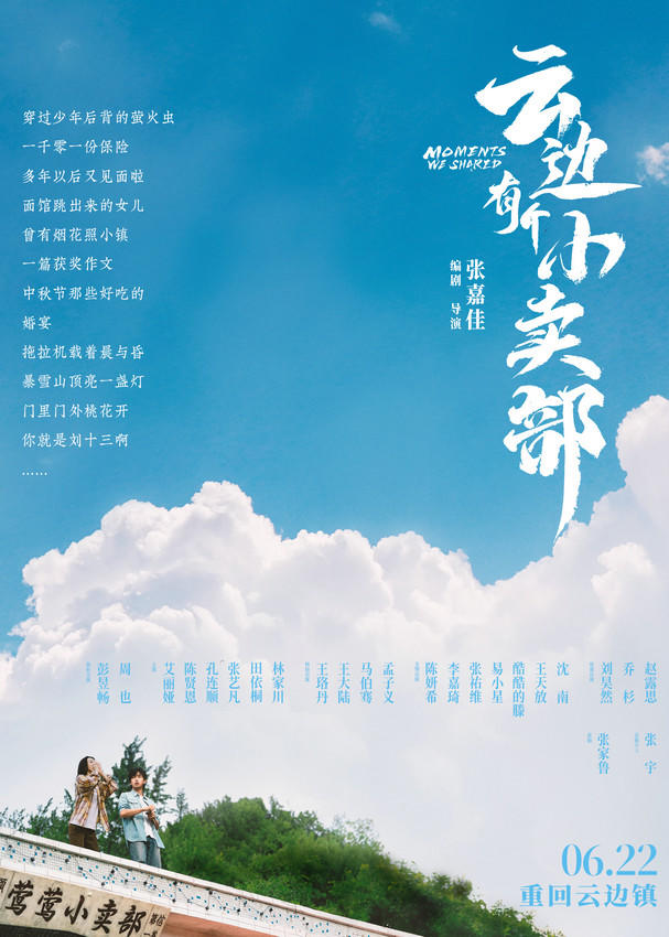 蓝天与白云交织的场景下,刘十三站在“莺莺小卖部”的天台上,一旁的程霜向着远方大声呼喊,与预告一同曝光的海报定格了这个瞬间的安逸和美好。海报左上角的一行行小字再次拨动了读者的心弦——“穿过少年后背的萤火虫”“一千零一份保险”“一篇获奖作文”“暴雪山顶亮一盏灯”……这些来自小说《云边有个小卖部》中脍炙人口的段落与情节,也将在大银幕上一一呈现。