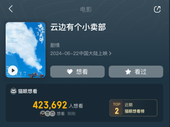 对于这部作品的影视化,张嘉佳曾表示没有这个打算,“拍电影太吃力不讨好了”。而在去年6月,电影《云边有个小卖部》正式开拍,并由张嘉佳本人担任导演和编剧,亲自操刀。由于原著小说的读者群体庞大,电影《云边有个小卖部》的上映自然也是备受瞩目。根据猫眼数据显示,目前想看这部影片的观众人数达到了42.3万,在近期想看榜中位列第二。