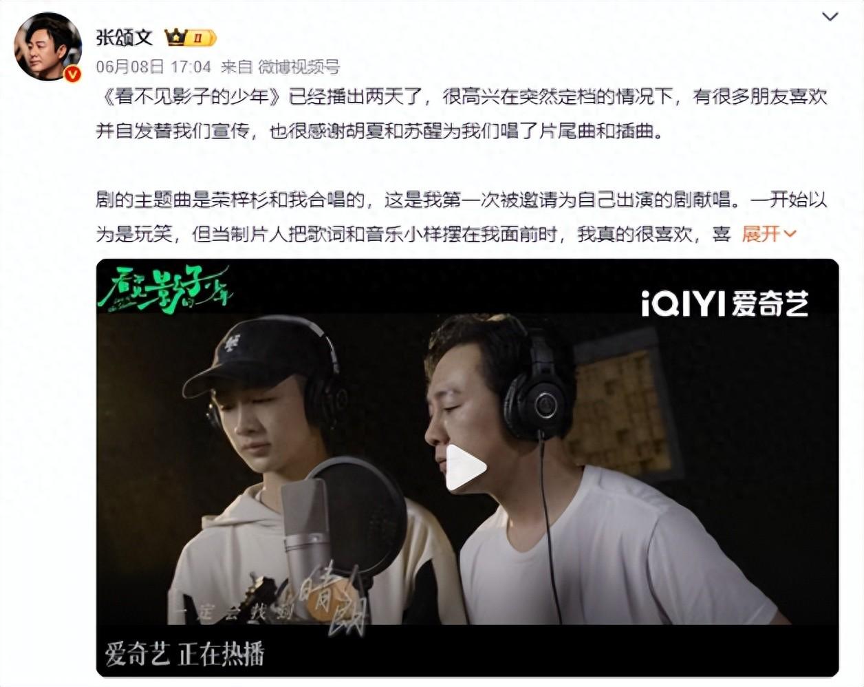 6月8日,演员张颂文发文称,《看不见影子的少年》主题曲是他与荣梓杉合唱的,“这是我第一次被邀请为自己出演的剧献唱。”