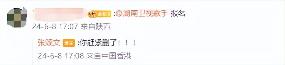 还有网友直接在评论区@湖南卫视歌手 节目组给张颂文报名,张颂文1分钟后火速回复“你赶紧删了!!!”粉丝还称那英需要他,他表示:“她还让我去她战队?”