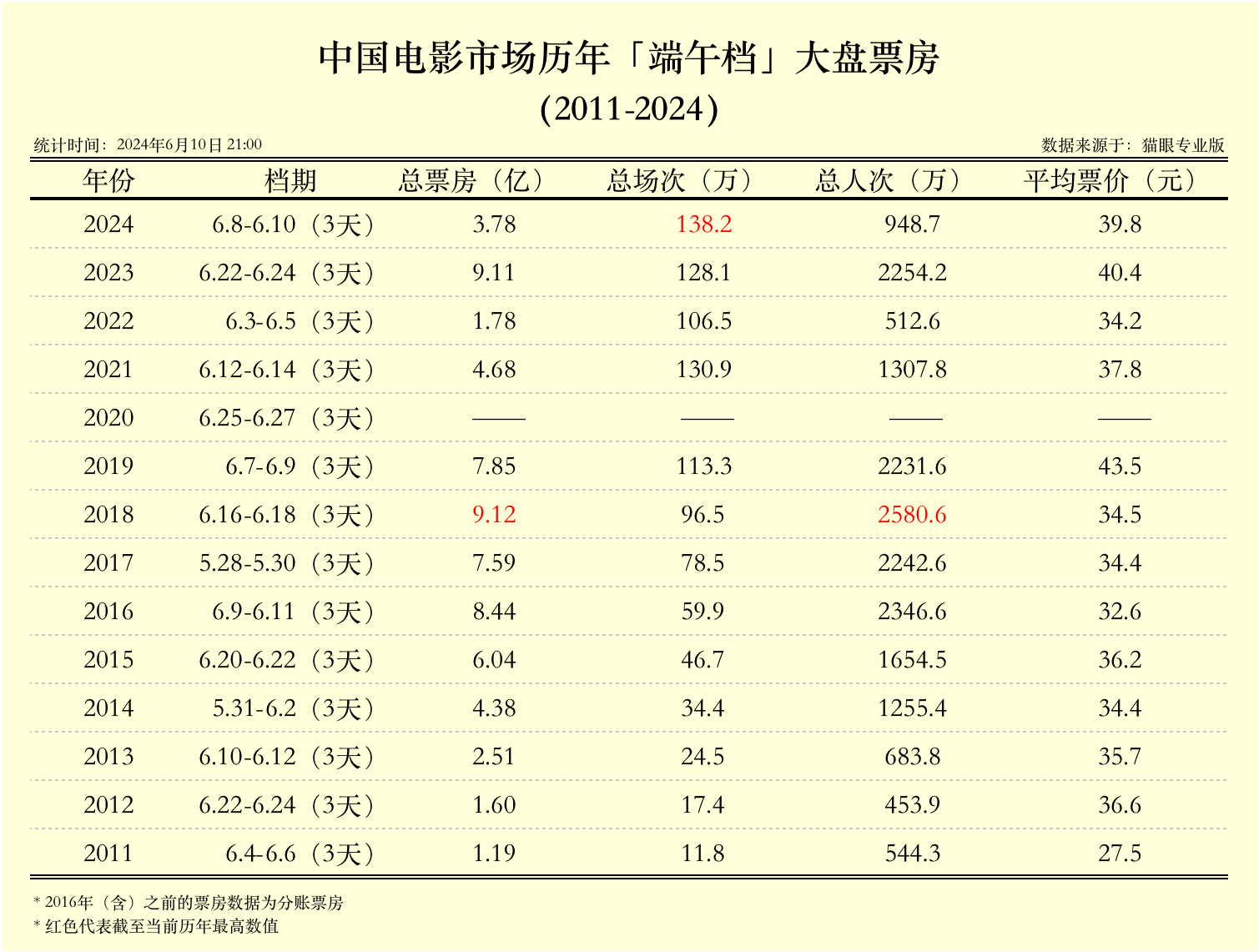猫眼专业版显示,今年端午档(6月8日-10日)总票房为3.78亿元,观影人次948.7万,总场次138.2万。档期票房不及去年一半,2023年端午档总票房为9.11亿元。