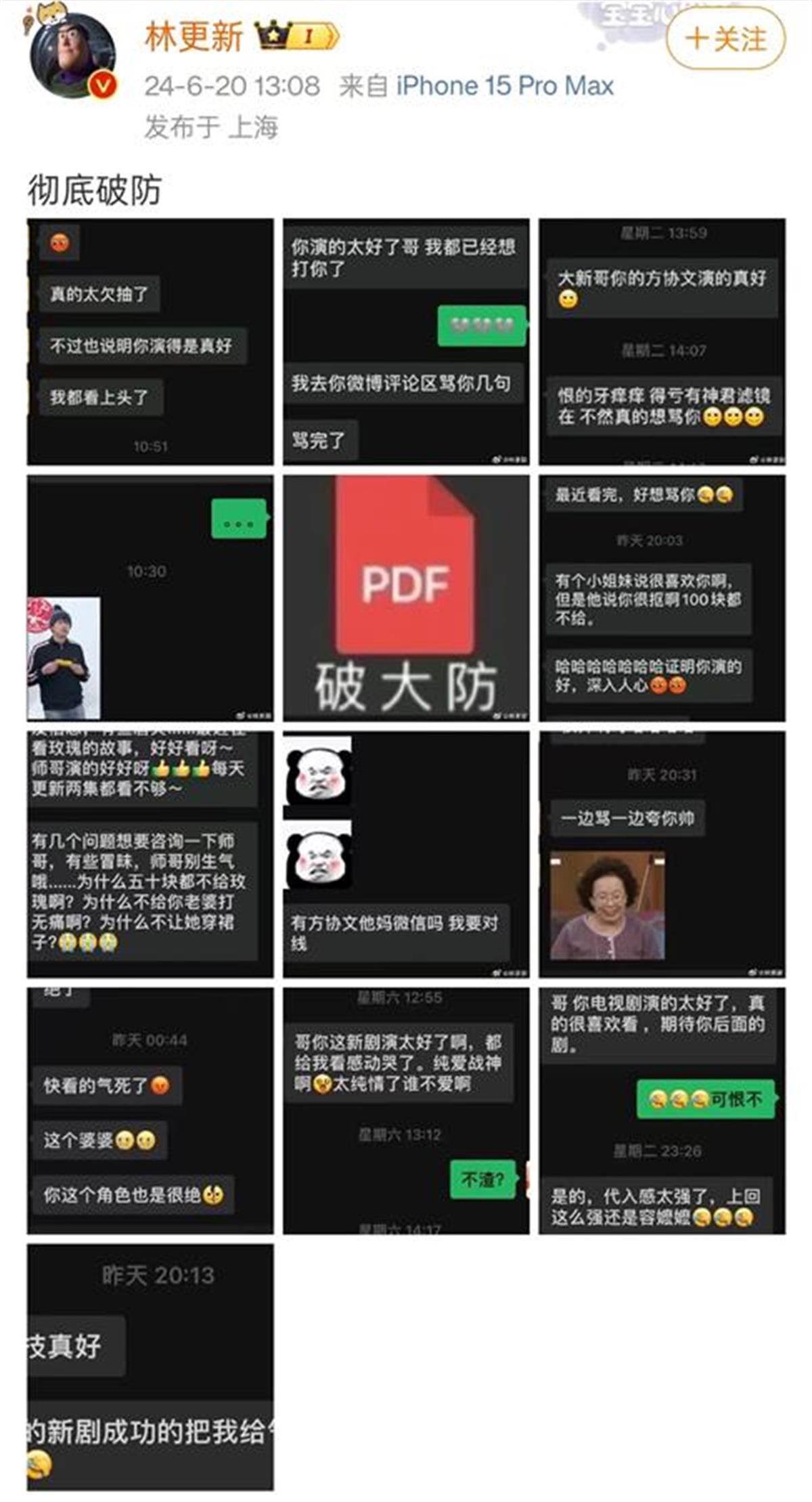 6月20日,林更新晒出与朋友的聊天记录,表示彻底破防。图片中,林更新因饰演方协文演得真好,“真的太欠抽了”,被朋友私信说恨得牙痒痒,深入人心。