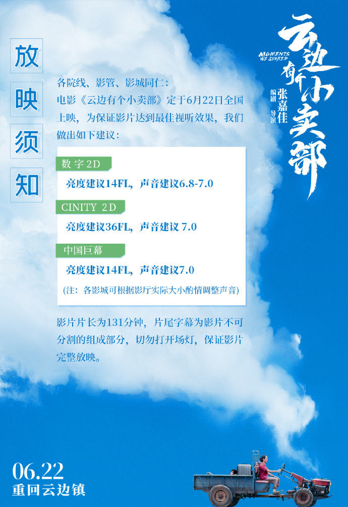 新京报讯6月22日,电影《云边有个小卖部》上映,官微发布放映建议,称“为保证影片达到最佳视听效果,建议各院线、影管、影城同仁按以下建议放映影片。”其中特意提到“片尾字幕为影片不可分割的组成部分,切勿打开场灯,保证影片完整放映。”