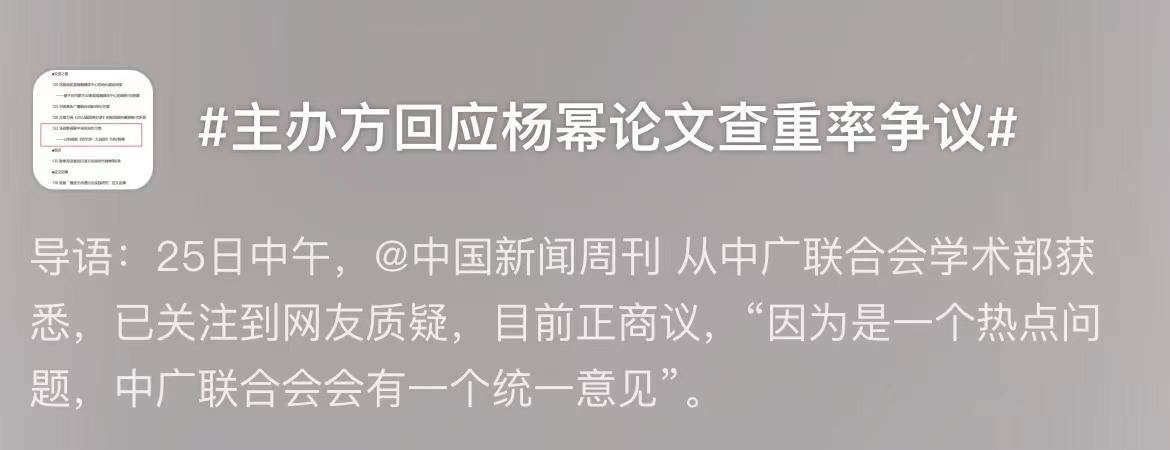 6月25日,#杨幂论文查重率#又登上微博热搜,有网友称给杨幂的论文查重发现查重率低,质疑其是否达到发刊标准。对此一事,网友们也是各执己见,有人认为,学术期刊收杨幂文章没问题,毕竟是学界业界结合,查重率低也合理。