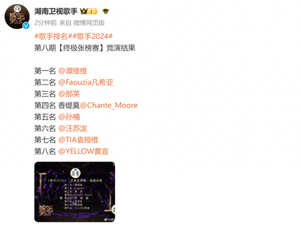 歌手2024第八期排名:
