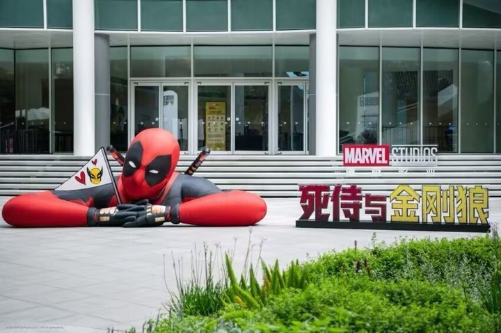 当日有一座巨型死侍气模空降上海影城。“死侍”双手交叠,歪头摆出“卖萌”姿势,手中印有金刚狼头像的小旗子更是吸睛无数。这座巨大的死侍气模一经亮相,立即吸引影迷们争相涌来,围绕在气模周围,或摆出各种姿势与之合影。