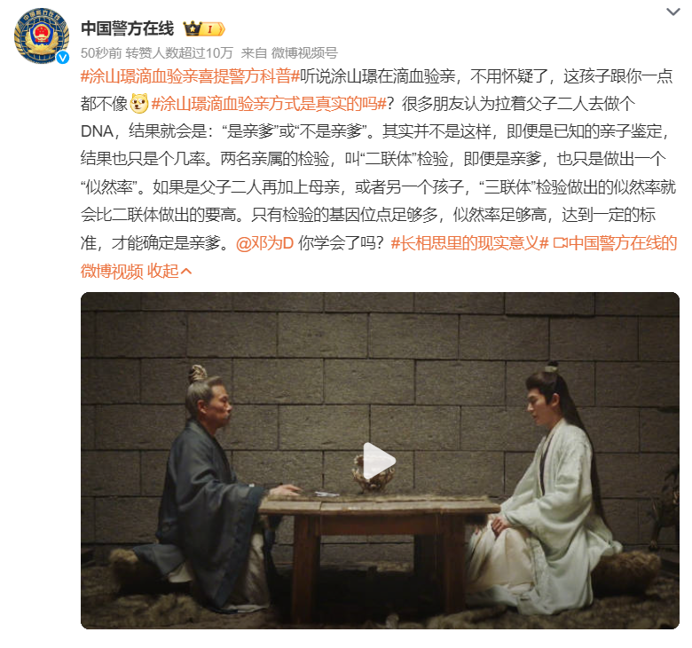 此视频发布后, “涂山璟滴血验亲喜提警方科普”一话题 冲上热搜!