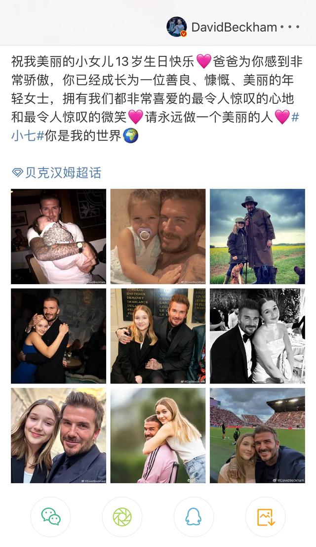 今(10)日,足坛名宿大卫·贝克汉姆在微博分享了九张与小女儿Harper Seven Beckham(小七)的合影,并中、英文对照发文庆祝女儿生日,他写道:“祝我美丽的小女儿13岁生日快乐,爸爸为你感到非常骄傲,你已经成长为一位善良、慷慨、美丽的年轻女士……小七你是我的世界。