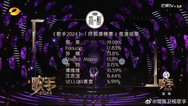 今(12日)晚,《歌手2024》第十期竞演落下帷幕。竞演结果公布:第一名那英、第二名Faouzia凡希亚、第三名孙楠、第四名 香缇莫Chante_Moore、第五名许钧TheTree、第六名谭维维、第七名汪苏泷、第八名YELLOW黄宣。