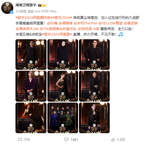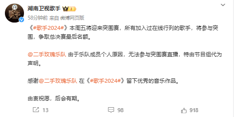 另外,二手玫瑰乐队由于乐队成员个人原因,无法参与突围赛直播,特由节目组代为声明。