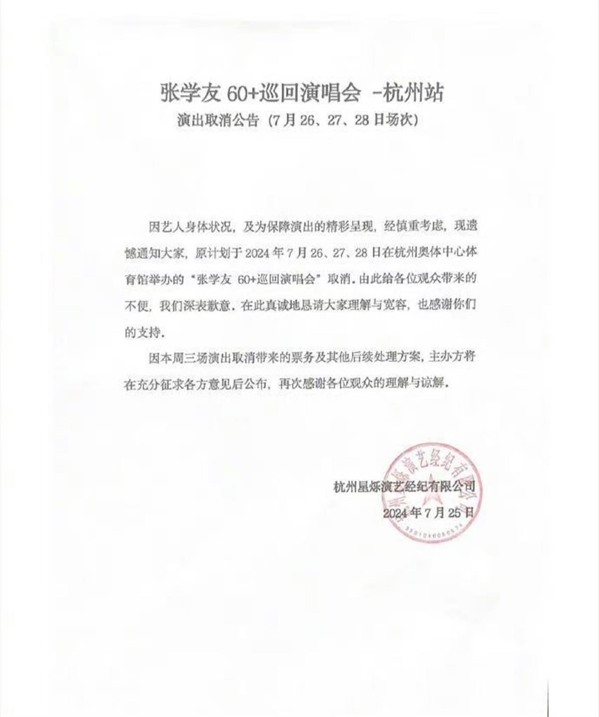 25日下午,张学友“60+”巡回演唱会杭州站主办方突发公告称,“因一人身体状况,及为保障演出的精彩呈现”,取消原计划将于26、27、28日在杭州奥体中心体育馆举行的三场演唱会,公告还表示,因为演出取消带来的票务及具体后续处理方案,将在“充分征求各方意见后公布”。