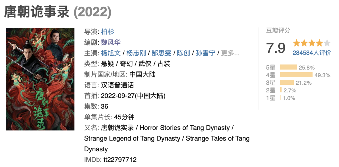 和其他同类别的古装探案剧相比,以唐传奇和唐志怪为基础的《唐朝诡事录》因其独特的人物设定和奇诡的案件故事,一经播出便受到了观众的热捧,豆瓣评分7.9,剧集热度居高不下,被网友评价为:“后劲太大,是近五年唯一一部从头追到尾没有快进的剧。”