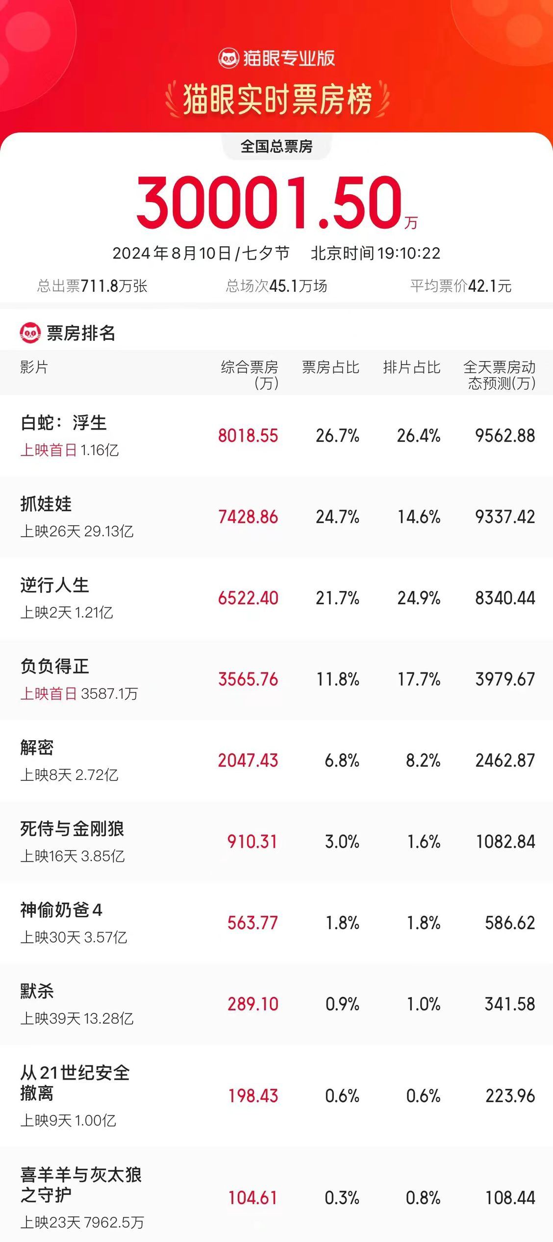据猫眼专业版数据,截至8月10日19时10分,2024年七夕档(8月10日)总票房破3亿!《白蛇:浮生》《抓娃娃》《逆行人生》暂列档期票房榜前三位。
