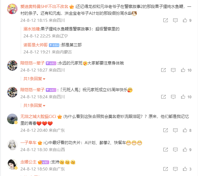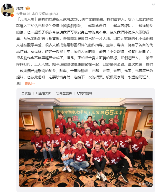 成龙写道:“‘元班人马’是我们为庆祝元家班成立65周年定的主题。我们这群人,从六七岁的时候就进入了于占元师父的香港中国戏剧学院,一起唱念做打,一起辛苦练功,一起挨师父的揍,也一起学了很多今后让我们可以安身立命的真本事。后来我们陆续进入电影行业,师兄弟师姐妹互相帮衬,慢慢闯出属于自己的一片天地,出自元家班的七小福也越来越被观众喜爱,很多人都成为电影圈很棒的动作指导、主演、导演,拥有了各自的代表作品。就这样,时光一过几十年,我们大家的脸上都有了不少皱纹,头发也花白了,很多动作也不能再轻易完成了,但是,正如洪金宝大哥说的那样,我们这群人,一辈子摔摔打打,上天入地,如今还能健健康康聚在一起,已经是个奇迹。这次聚会,我们一起缅怀已经离开的师父、师母、于素秋师姐、元麟、元音、元茹、元奎、元蓉等兄弟姐妹,也彼此嘱咐一定要珍惜身体,迎接下一次的相聚。祝福元家班,永远的元班人马!”