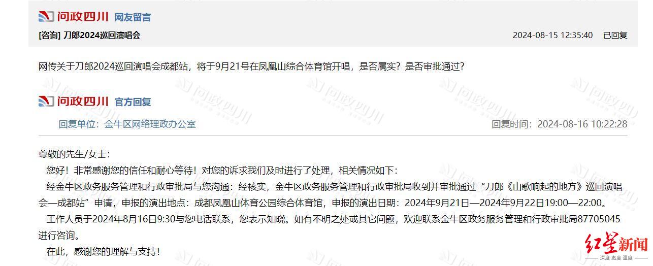 其中,8月16日,成都金牛区网络理政办公室在回复网友咨询时表示,经核实,金牛区政务服务管理和行政审批局收到并审批通过“刀郎《山歌响起的地方》巡回演唱会—成都站”申请。该巡回演唱会成都站申报的演出地点为成都凤凰山体育公园综合体育馆,申报的演出日期为9月21日、22日19时至22时。