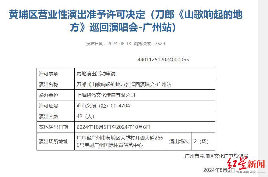 广州市黄埔区文化广电旅游局公开的营业性演出准予许可决定显示,许可的演出名称为“刀郎《山歌响起的地方》巡回演唱会-广州站”,演出日期为今年10月5日至6日,演出场所为广州国际体育演艺中心,演出场次为2场。
