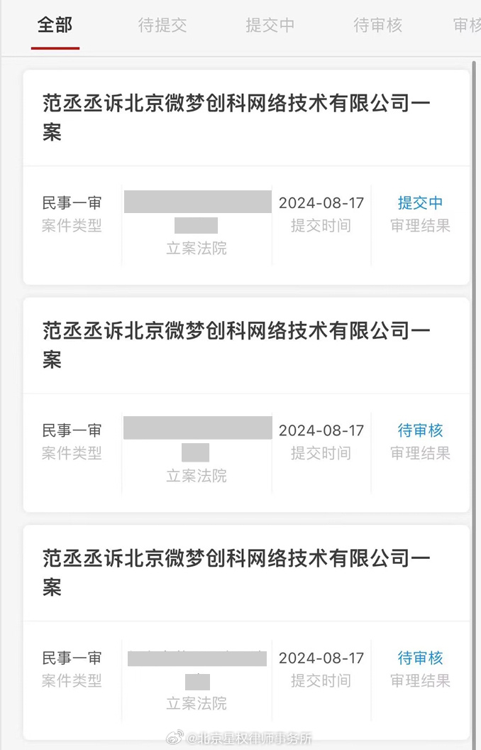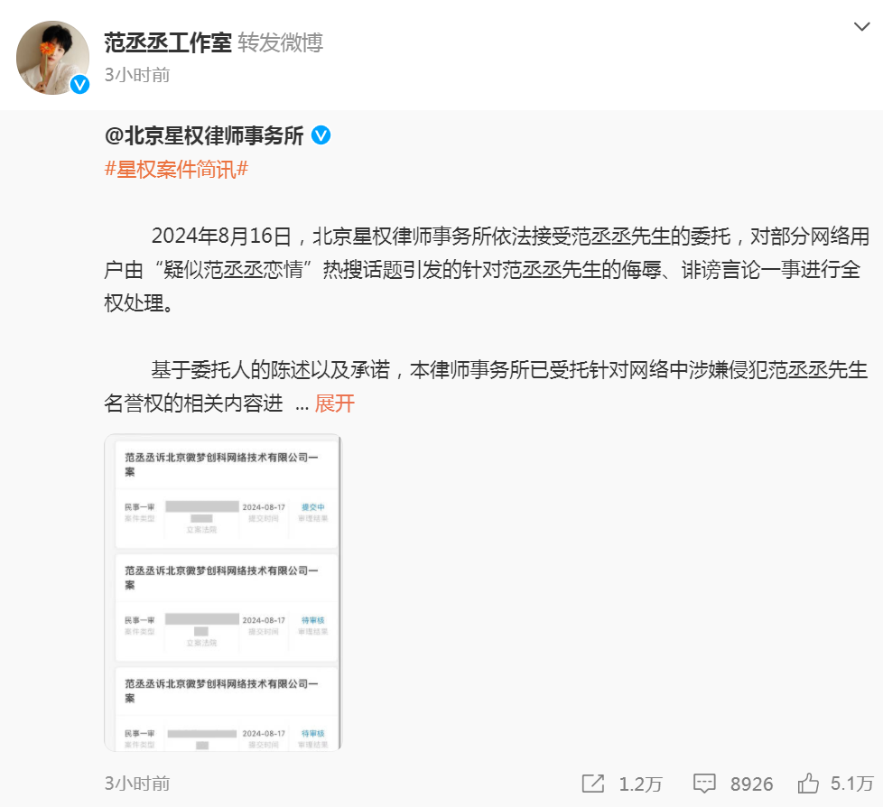 2024年8月17日,本律师事务所已受托将①UID为7735***038的微博用户、②UID为6470***306的微博用户、③UID为5997***052的微博用户【公然发布“骚扰女明星”“黄浦江偶遇男明星和嫂子收获15万的事居然是fcc”“渣男”等涉嫌诽谤、侮辱范丞丞先生的言论】起诉至法院,现已完成立案材料(身份信息披露阶段)的递交工作。
