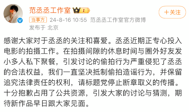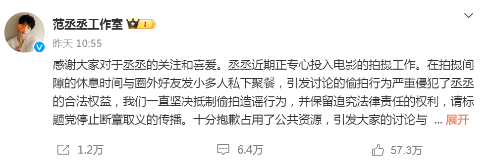 16日晚,范丞丞工作室微博发文:感谢大家对于丞丞的关注和喜爱。丞丞近期正专心投入电影的拍摄工作。在拍摄间隙的休息时间与圈外好友发小多人私下聚餐,引发讨论的偷拍行为严重侵犯了丞丞的合法权益,我们一直坚决抵制偷拍造谣行为,并保留追究法律责任的权利,请标题党停止断章取义的传播。十分抱歉占用了公共资源,引发大家的讨论与猜测,期待新作品早日跟大家见面。