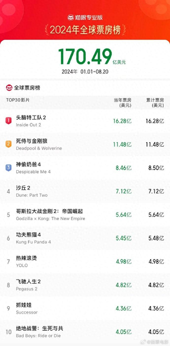 8月21日,据猫眼专业版全球票房数据显示,截至8月20日,2024年全球总票房已超170.49亿美元,前十分别为《头脑特工队2》《死侍与金刚狼》《神偷奶爸4》《沙丘2》《哥斯拉大战金刚狼2:帝国崛起》《功夫熊猫4》《热辣滚烫》《飞驰人生2》《抓娃娃》《绝地战警:生死与共》。