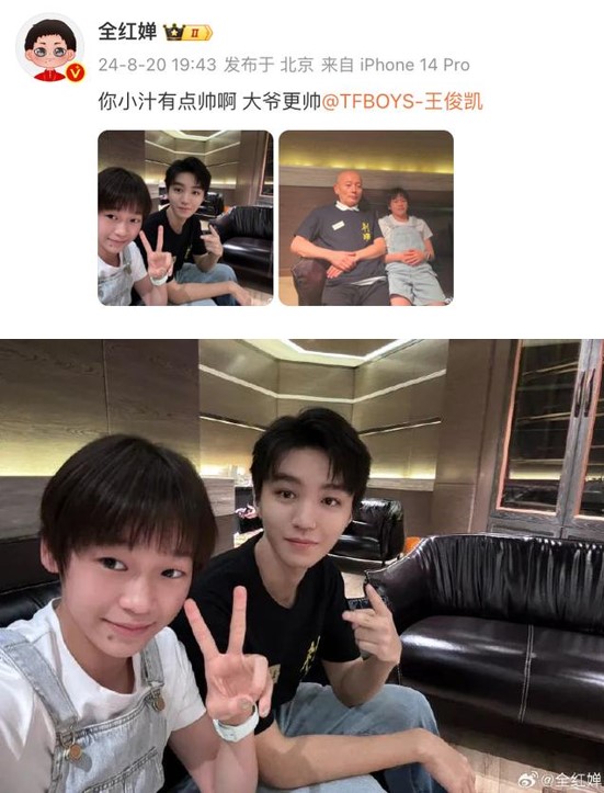 日前,全红婵出席电影《刺猬》北京首映礼,并在个人微博上分享了两张照片,配文:“你小汁有点帅啊,大爷更帅。”照片中,一张是与王俊凯合影比“耶”,另一张则是和演员葛优一起瘫坐在沙发上。