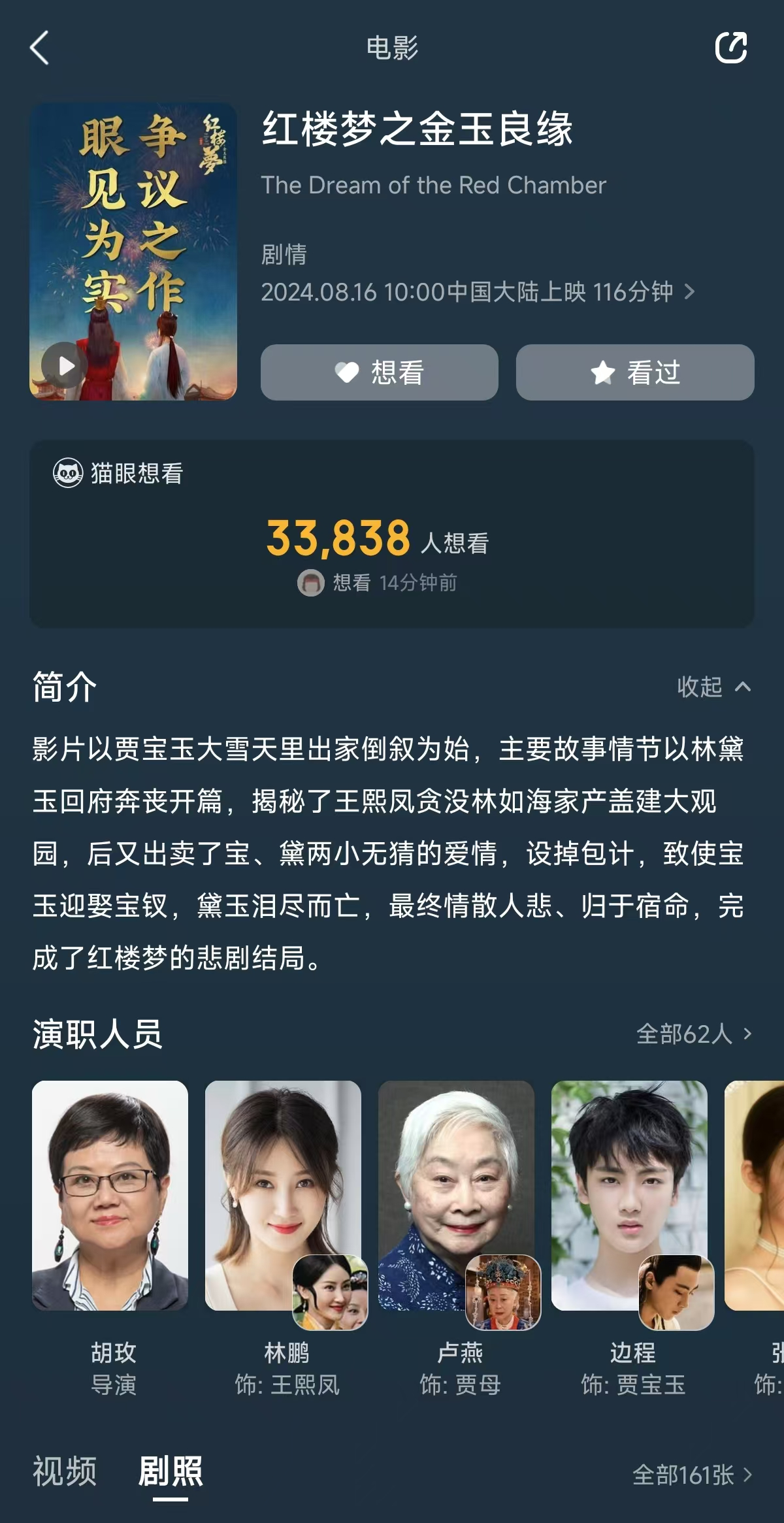 近日,由胡玫导演的电影《红楼梦之金玉良缘》上映,在互联网上引发了广泛争议,不少观众表达了对电影质量的不满,批评选角离谱、布景浮夸、剧情杂乱。