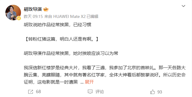 21日,胡玫晒出力挺《红楼梦之金玉良缘》的文章,称:“明白人还是有啊。”文章里强调:深信《新红楼梦》是经典大片,圈内大腕与红学家看完后都集体鼓掌,很多人想看,但买不到票,胡玫作品经常挨黑,有人故意黑,这次风暴比以前更大。