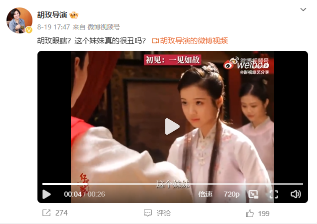 面对网友觉得张淼怡版林黛玉不好看,“一黛不如一黛”的质疑,导演胡玫在微博上连续发声回应。她先是晒出一段电影中宝玉和黛玉的视频,并反问网友:“胡玫眼瞎?这个妹妹真的很丑吗?”